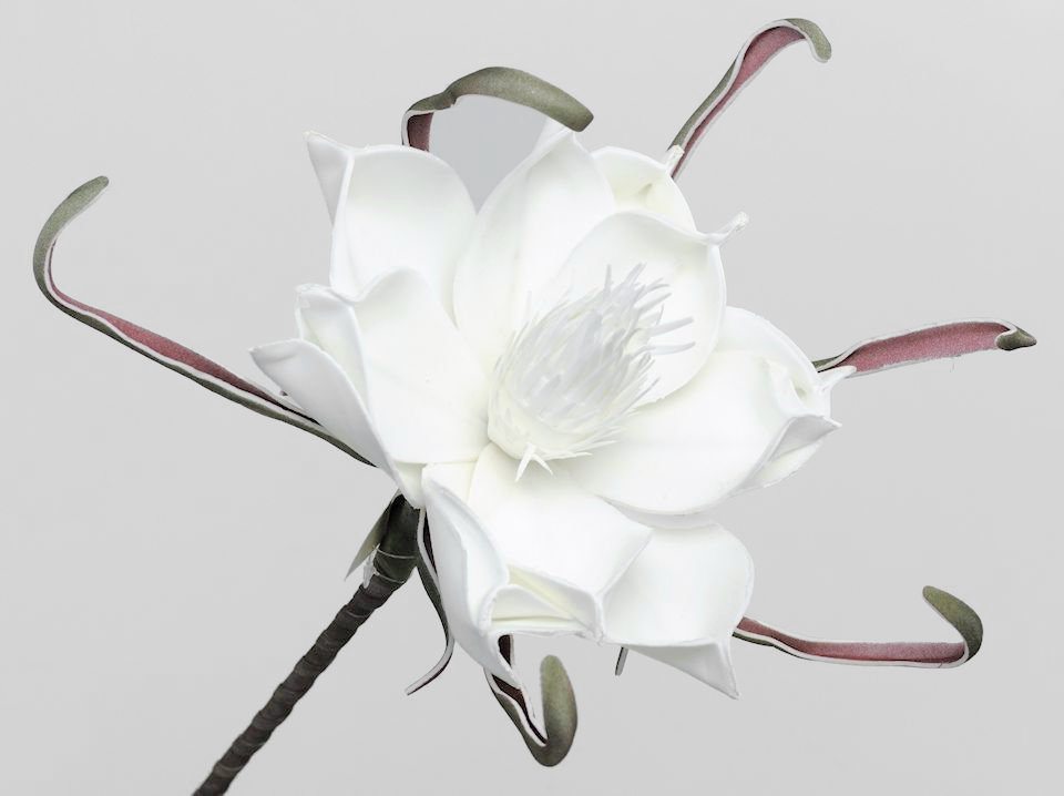 Deze prachtige hagelwitte foambloem heeft een lange steel die versterkt is met ijzerdraad. De steel is hierdoor in allerlei richtingen te buigen en te bevestigen aan bijvoorbeeld een tak of stronk. De steel is ook goed in te korten zodat ze in een pot of vaas geschikt kunnen worden.