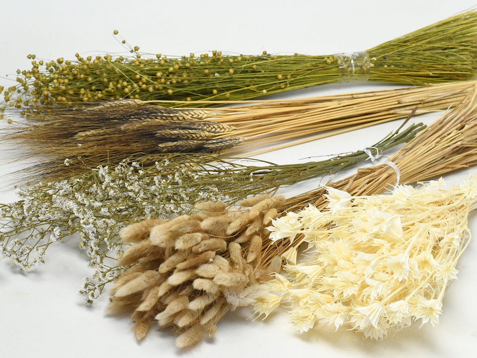Het DIY pakket dat u koopt bevat de volgende artikelen: Statice Sinuata Wit, Lagurus Naturel, Linum, Tarwe black Beard, Acroclinium Wit